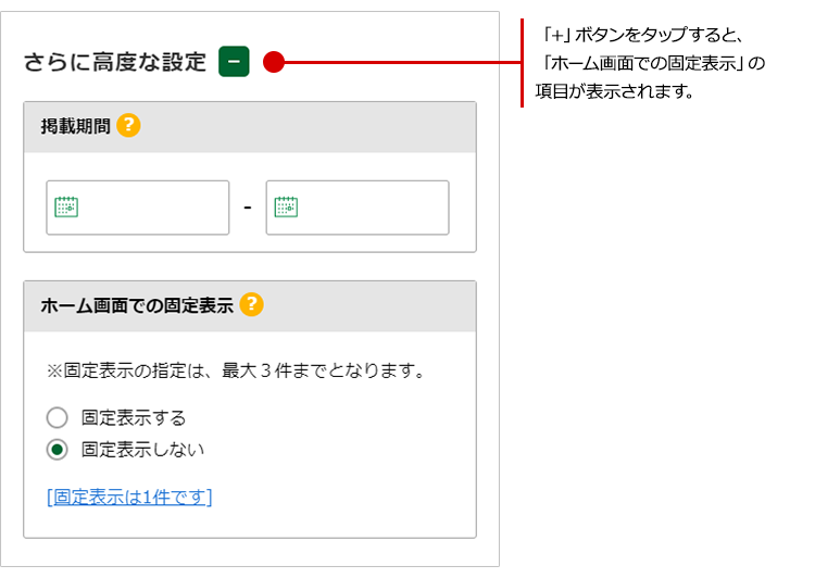 お知らせの入力画面の下部にある「さらに高度な設定」右横の「+」ボタンをタップすると、「ホーム画面での固定表示」の項目が表示されます。