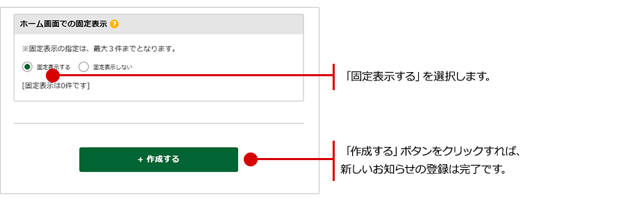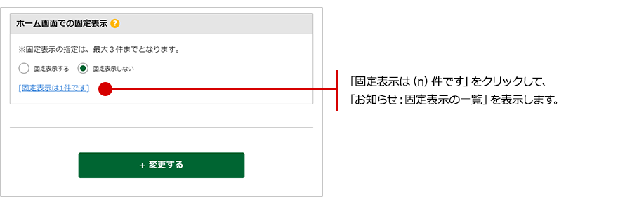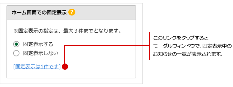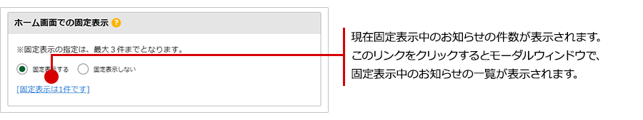 「固定表示は(n)件です」の'n'の箇所に、現在固定表示中のお知らせの件数が表示されます。