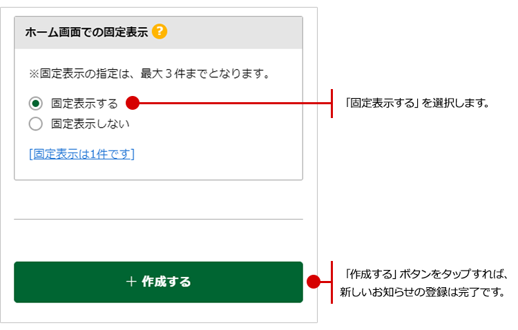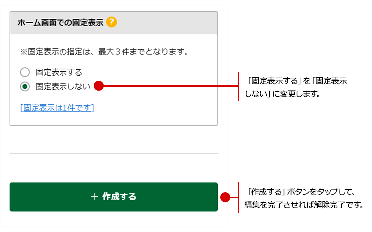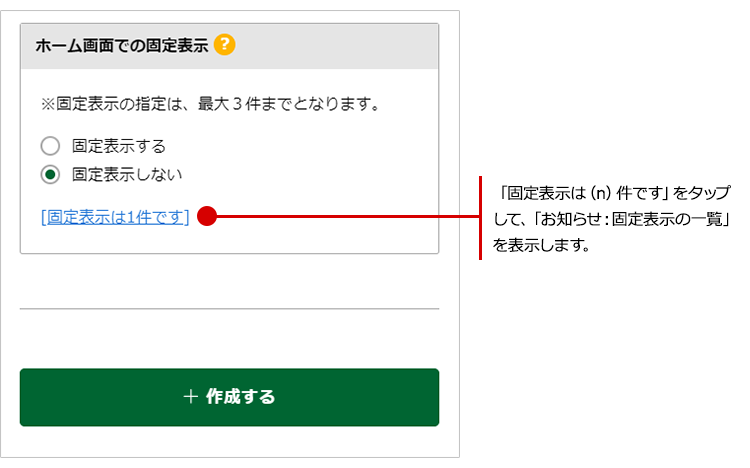 現在、編集中のお知らせを固定表示しないようにする場合は、「ホーム画面での固定表示」の項目の「固定表示する」を「固定表示しない」に変更し、「作成する」ボタンをタップして、編集を完了させれば解除完了です。