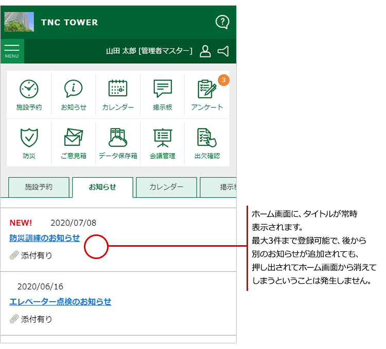 最新のお知らせが入っても押し出されないお知らせを同時に3件まで掲載できます。