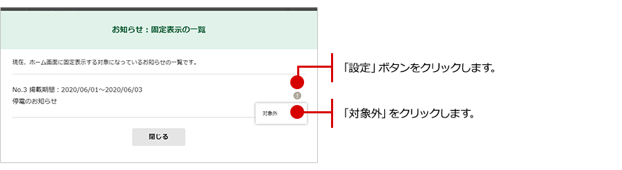 固定表示の対象から外したいお知らせの右端にある「設定」ボタンから