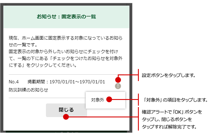 現在、編集中では無いお知らせを固定表示の対象から外す場合は、
