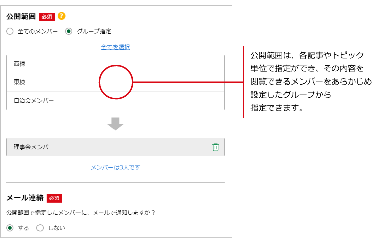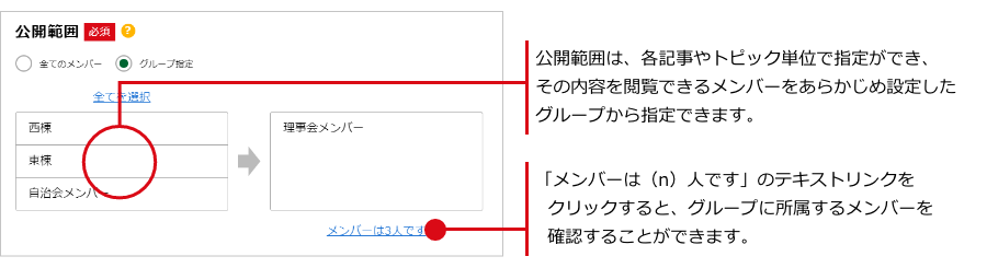その内容を閲覧できるメンバーをあらかじめ設定したグループから指定できます。