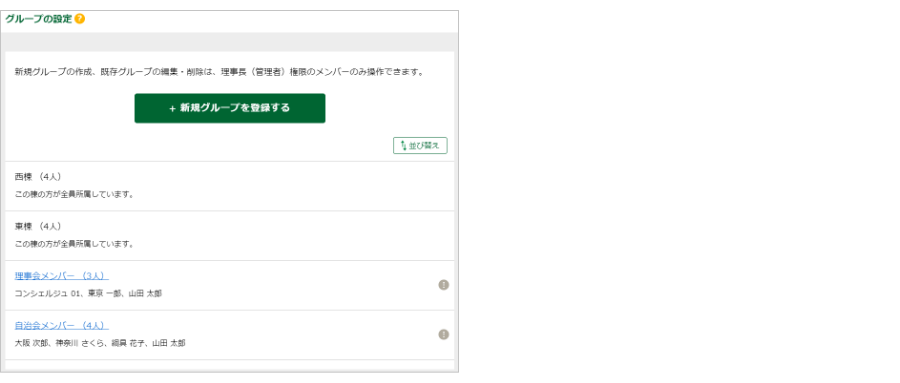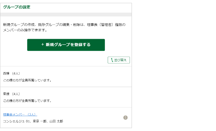 「管理者マスター」「管理者A」の権限を持つユーザーだけが、グループの作成・編集が可能です。
