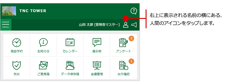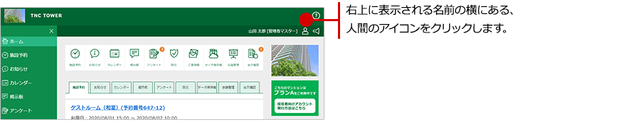 ホーム画面の右上に表示される名前の横にある、人間のアイコンをクリックします。