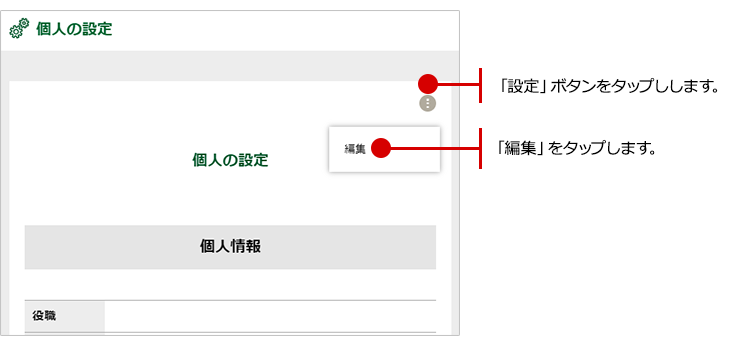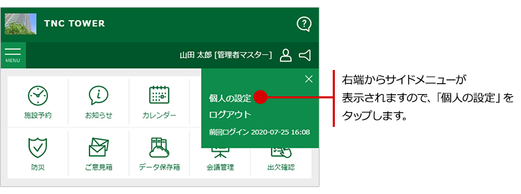右端からサイドメニューが表示されますので、「個人の設定」をタップします。