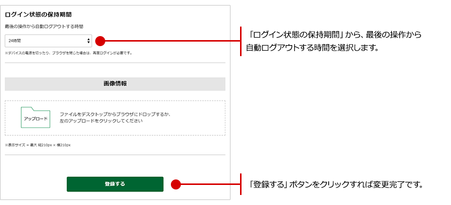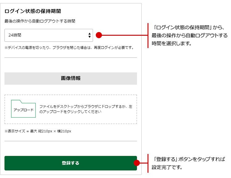 「ログイン状態の保持期間」から、最後の操作から自動ログアウトする時間を選択し、「登録する」ボタンをタップすれば設定完了です。
