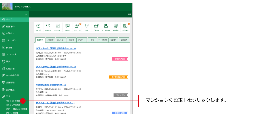 ナビゲーションの中にある「マンションの設定」をクリックします。