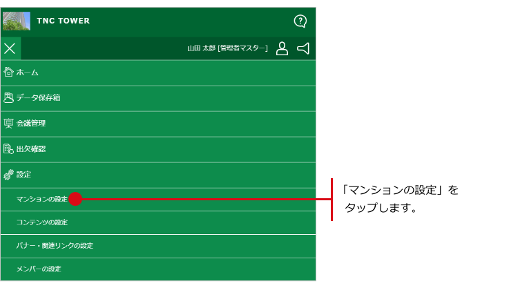 ナビゲーションの中にある「マンションの設定」をタップします。