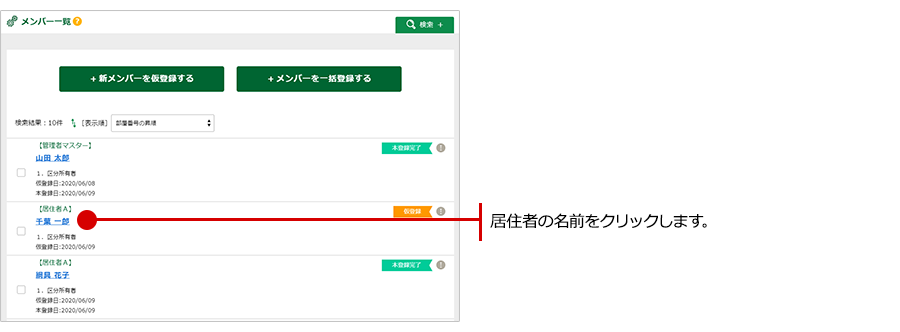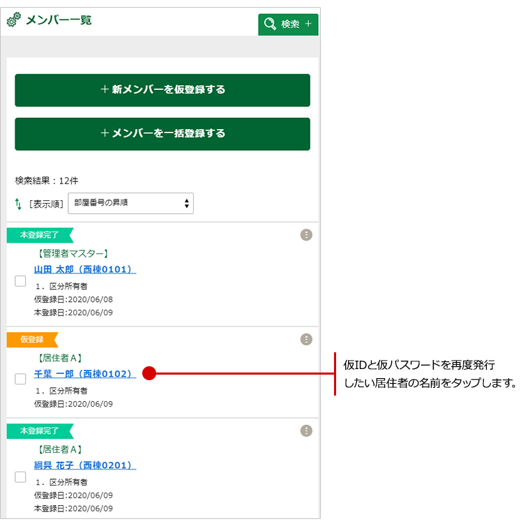 メンバー一覧が表示されますので、仮IDと仮パスワードを再度発行したい