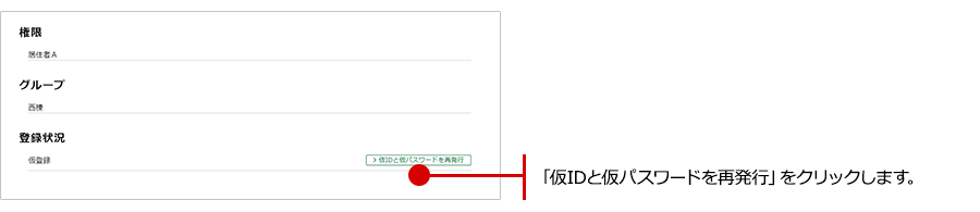 「登録状況」の項目に表示されている、「仮IDと仮パスワードを再発行」をクリックします。