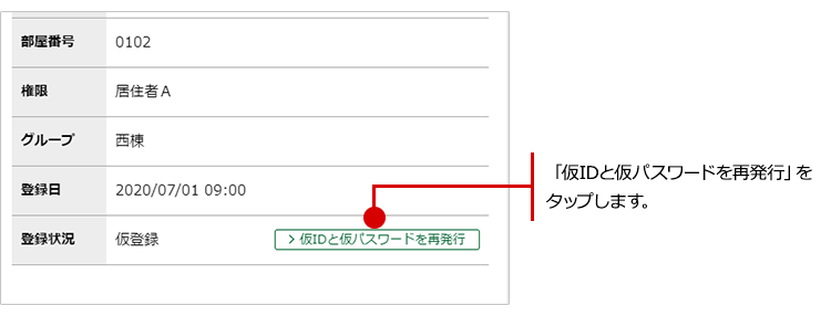 「登録状況」の項目に表示されている、「仮IDと仮パスワードを再発行」をタップします。