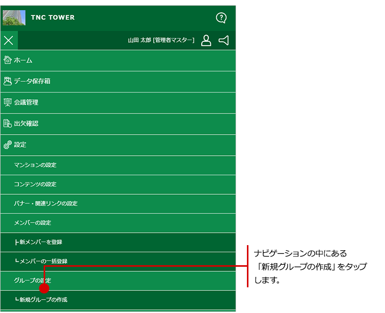 ナビゲーションの中にある「新規グループの作成」をタップします。