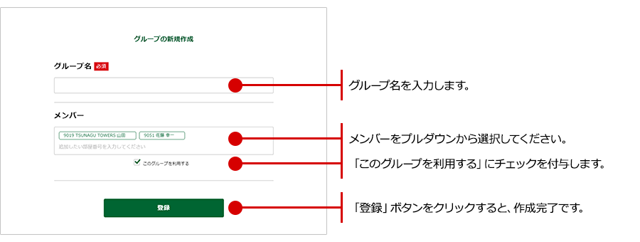 グループ名を入力し、メンバーをプルダウンから選択してください。