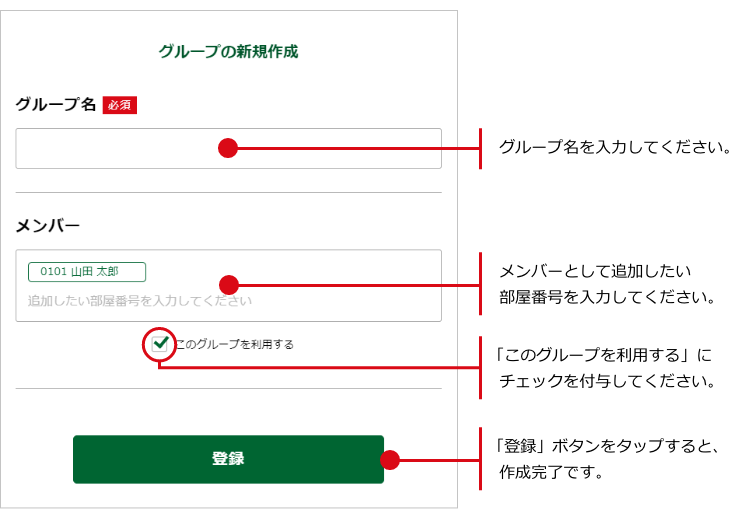 「このグループを利用する」にチェックを付与し、「登録」ボタンをタップすると、作成完了です。