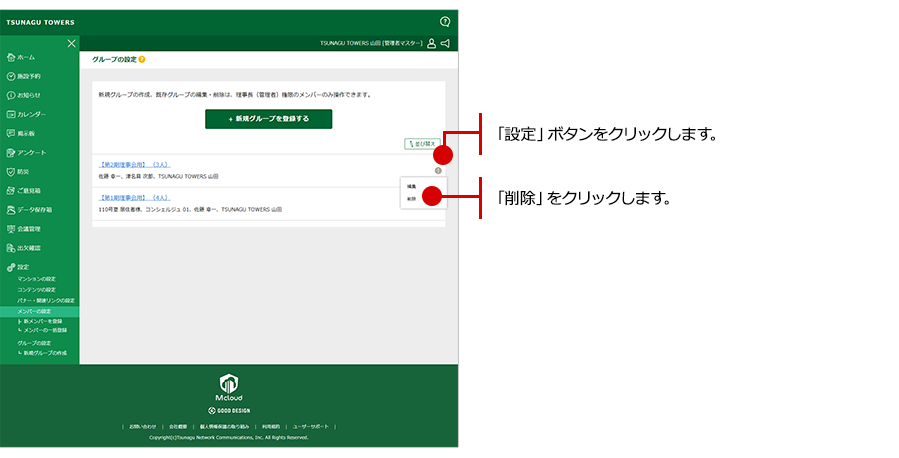 該当グループを指定しているすべてのコンテンツ(お知らせやファイル等)で、他のグループを指定しなおすか、コンテンツ自体を削除してください。該当グループがどのコンテンツからも指定されていない状態になれば、そのグループを削除できます。