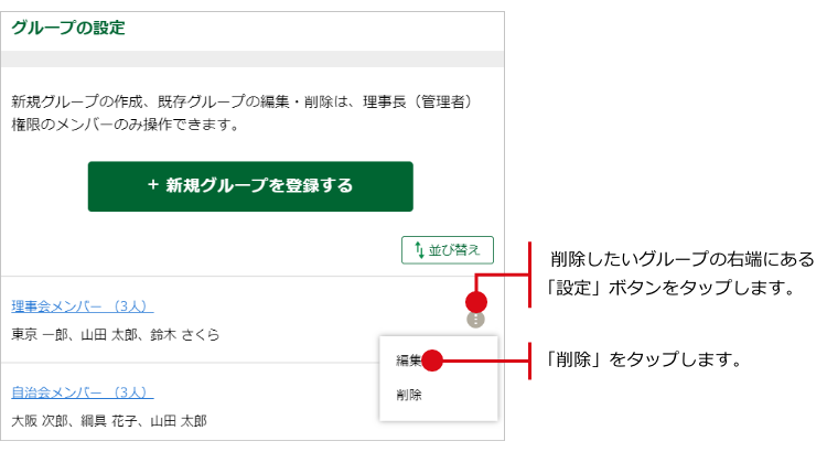 ※グループの削除では無く、あくまで非表示化する設定のため、グループ設定画面の一覧には残ります。