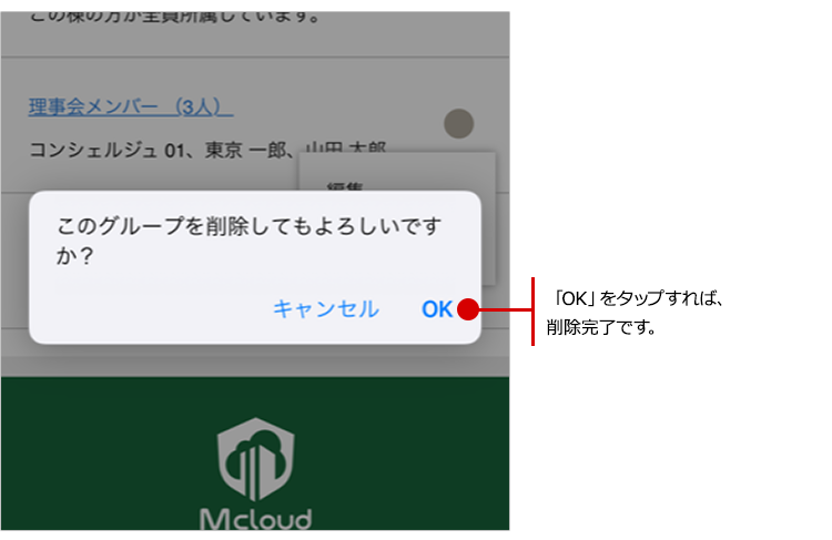 「このグループを削除してもよろしいですか?」という確認ウィンドウが表示されるので、「OK」をタップすれば、削除完了です。