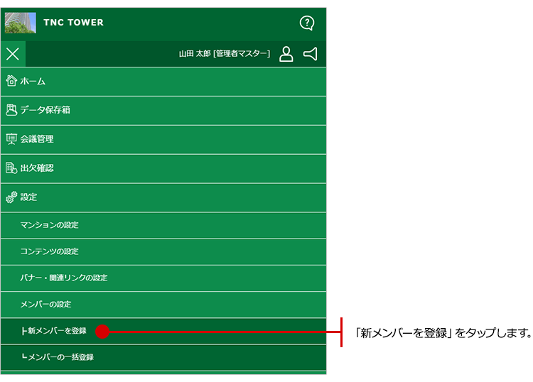 ナビゲーションの中にある「新メンバーを登録」をタップします。