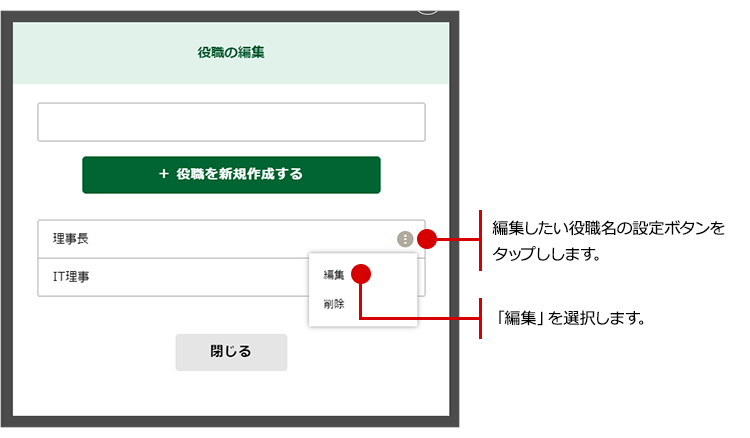「役職の編集」画面で、編集したい役職名の設定ボタンをタップし、「編集」を選択します。
