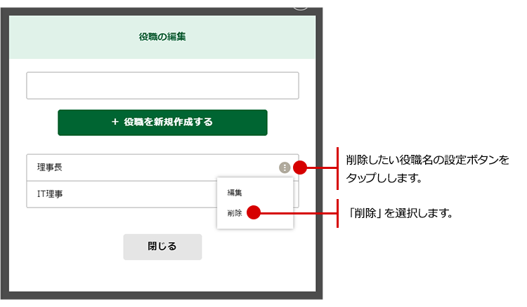 「役職の編集」画面で、削除したい役職名の設定ボタンをタップし、「削除」を選択します。