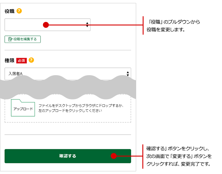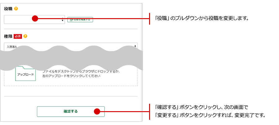 「役職」のプルダウンから役職を変更うえ、「確認する」ボタンをクリックします。
