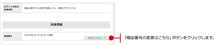 個人の設定ページ下部、「決済情報」の項目にある、「暗証番号の変更はこちら」ボタンをクリックします。