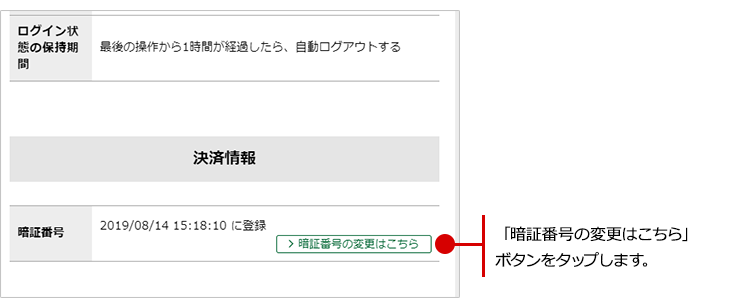 個人の設定ページ下部、「決済情報」の項目にある、「暗証番号の変更はこちら」ボタンをタップします。
