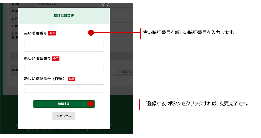 古い暗証番号、新しい暗証番号を入力し、「登録する」ボタンをクリックすれば、変更完了です。