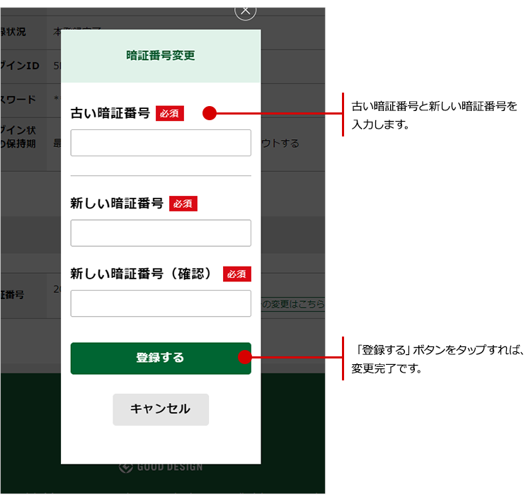 古い暗証番号、新しい暗証番号を入力し、「登録する」ボタンをタップすれば、変更完了です。