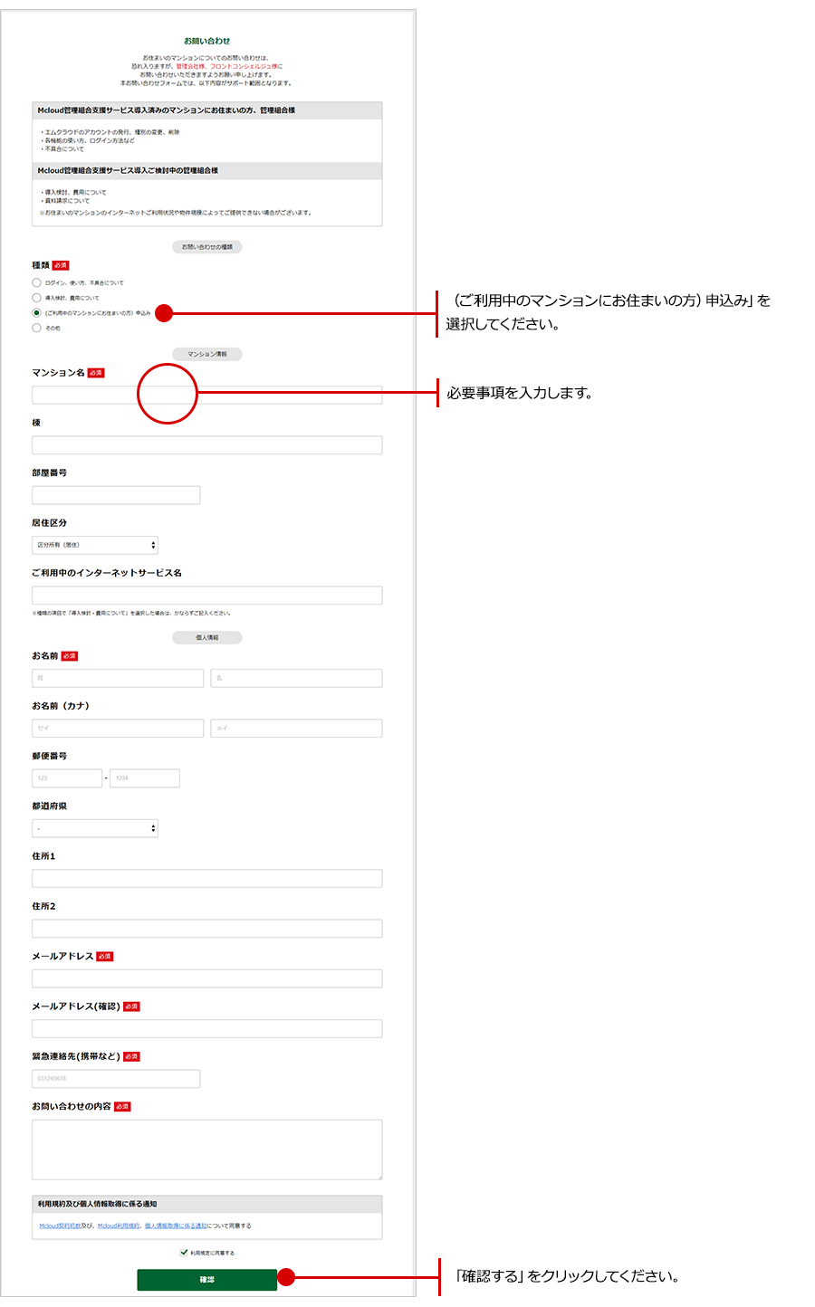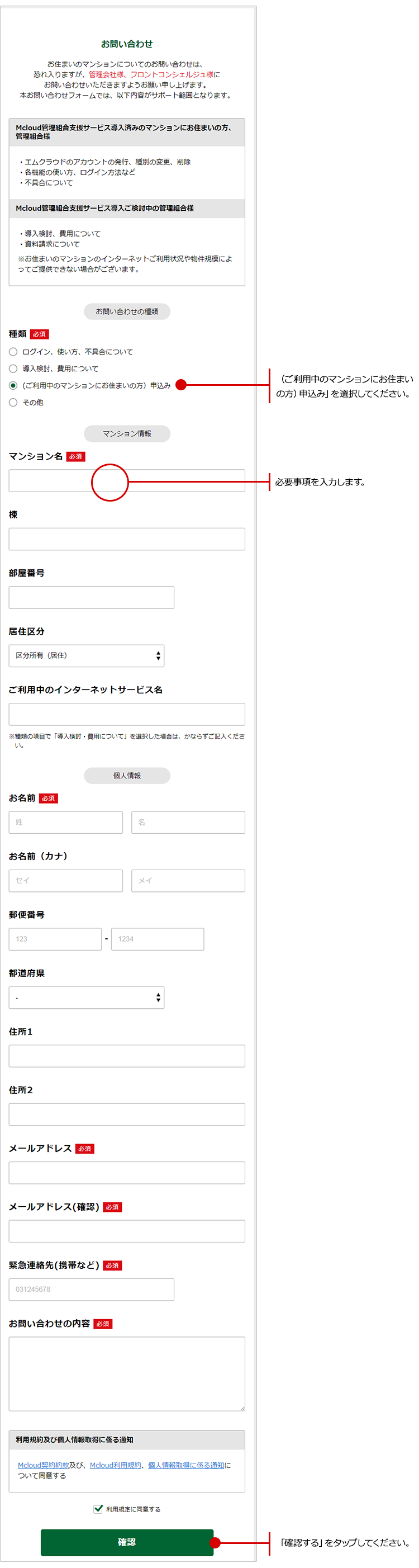 表示されたフォームの「お問い合わせの種類」で、「(ご利用中のマンションにお住まいの方)申込み」を選択してください。