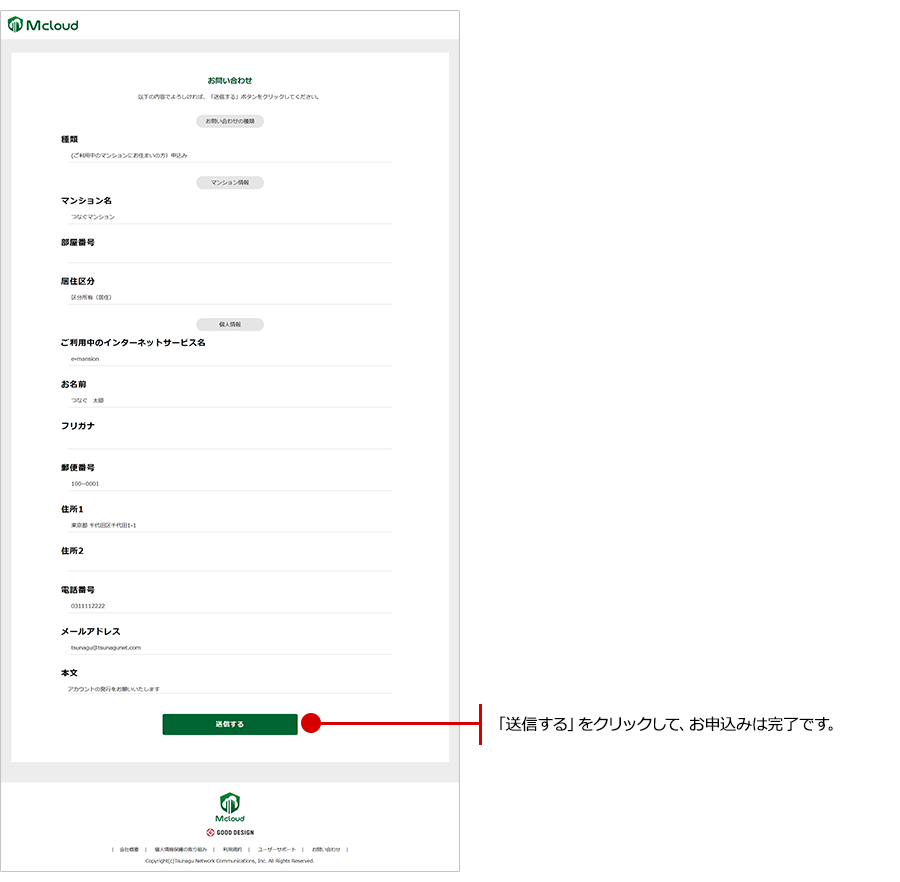 次の画面で「送信する」をクリックして、お申込みは完了です。
