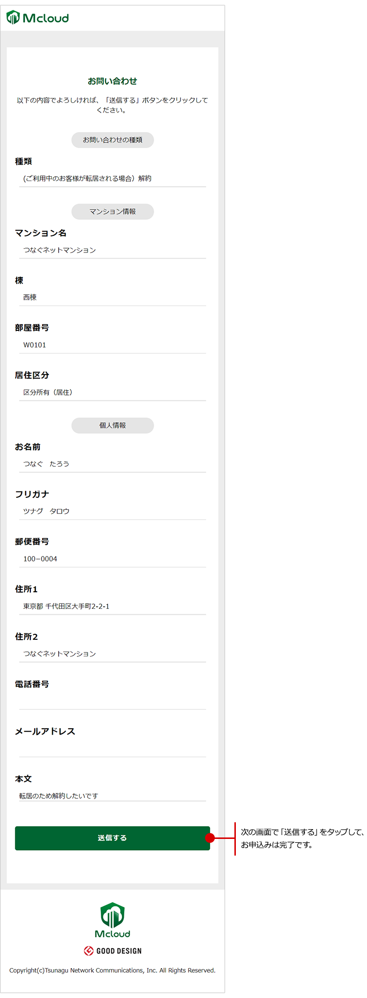 次の画面で「送信する」をタップして、お申込みは完了です。