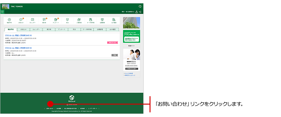 ログイン後ページの「お問い合わせ」リンクをクリックします。