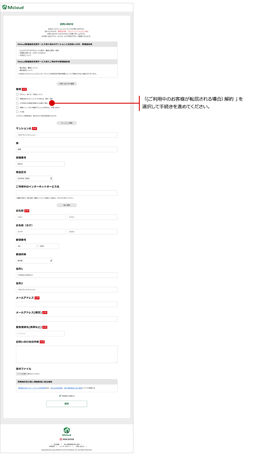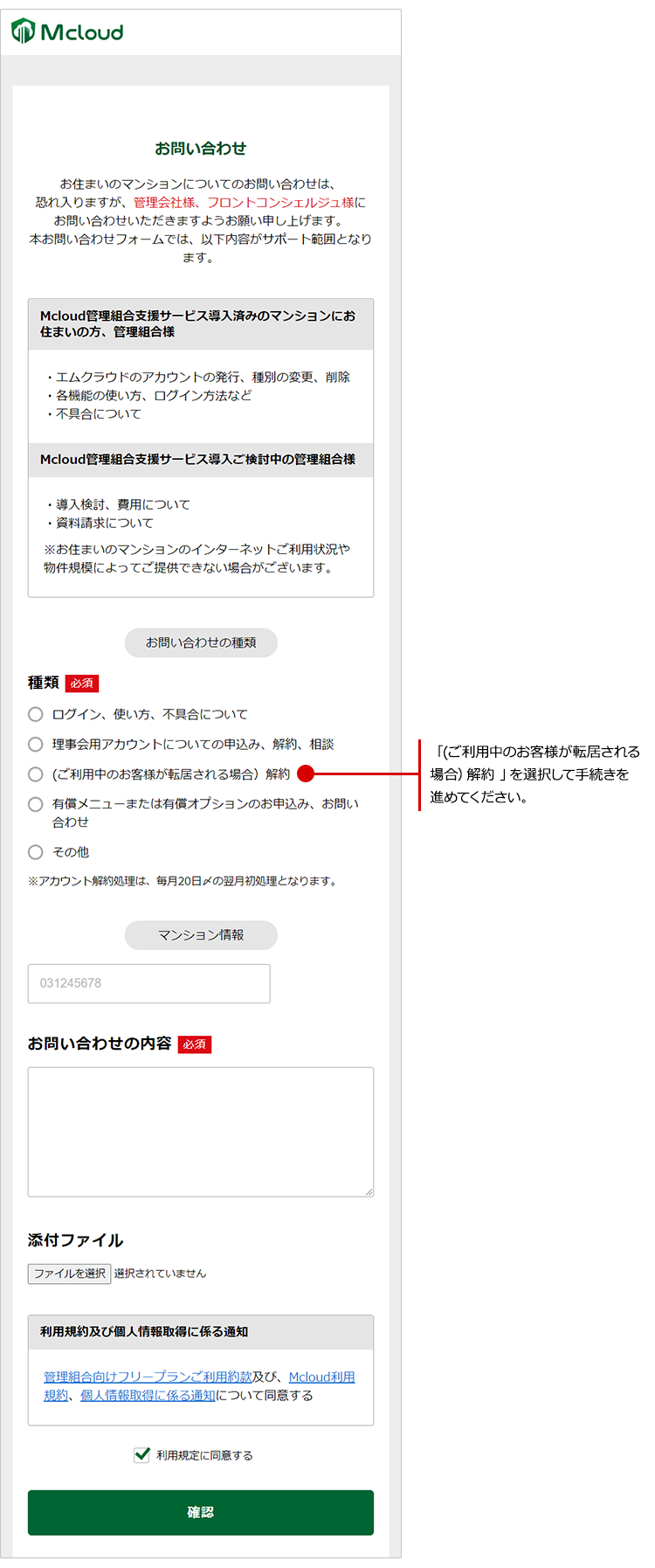 マンション転出の際はログイン後ページにあるお問い合わせフォームから手続きを行ってください。個人情報を削除させていただきます。