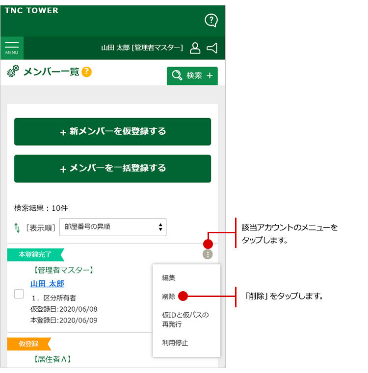 マンション転出の際は、管理者アカウントを持った方(管理会社や理事長など)に対応いただきます。管理者の方は、居住者の方からアカウントの削除依頼がありましたら下記の手順でご対応ください。
