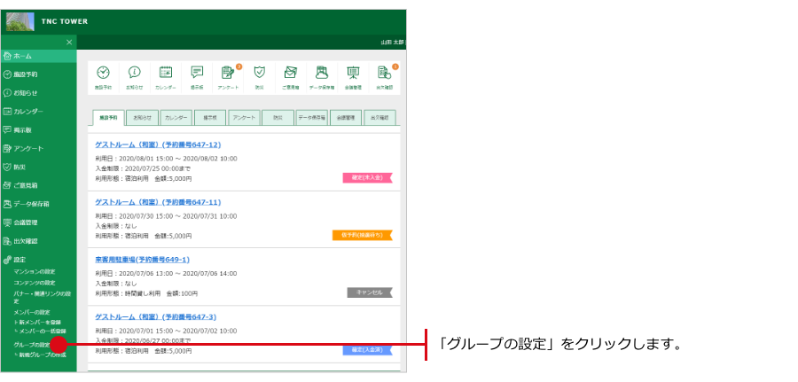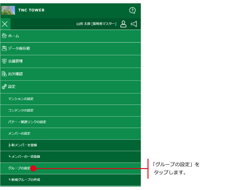 ナビゲーションの中にある「グループの設定」をクリックします。