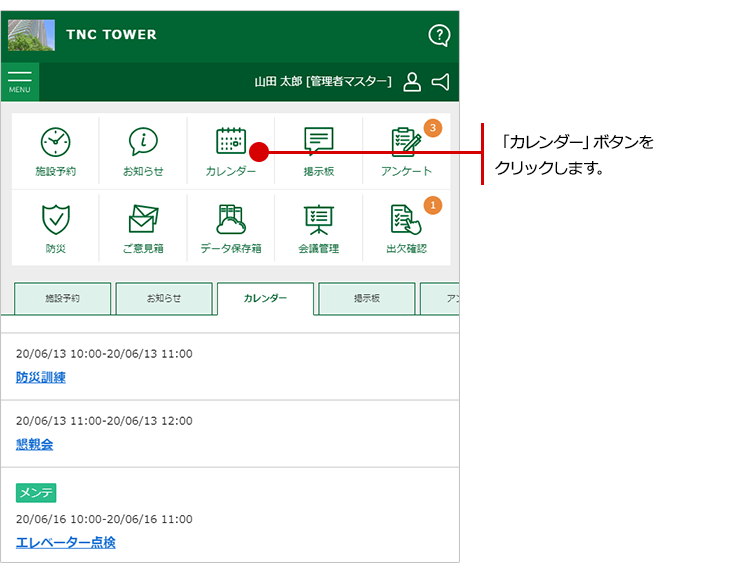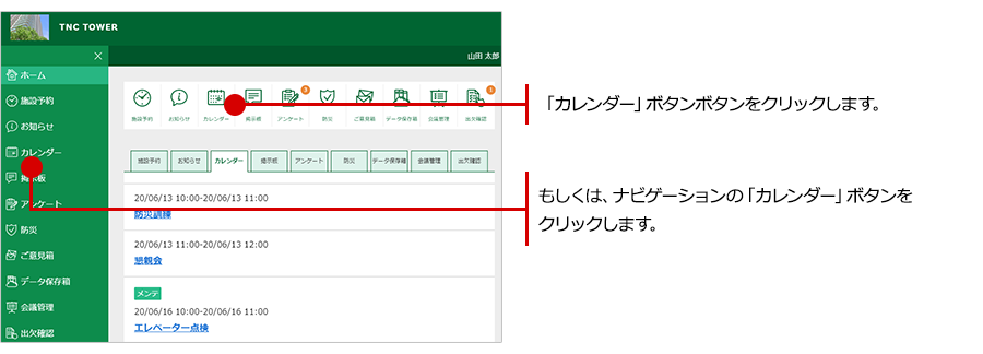 ホーム画面の「カレンダー」ボタンや、ナビゲーションの「カレンダー」ボタンをクリックします。