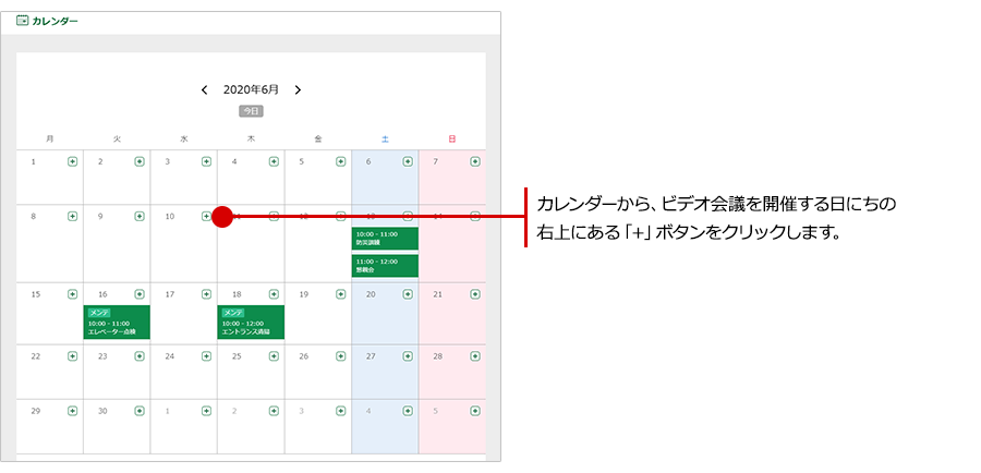 カレンダーから、ビデオ会議を開催する日にちの右上にある「+」ボタンをクリックします。