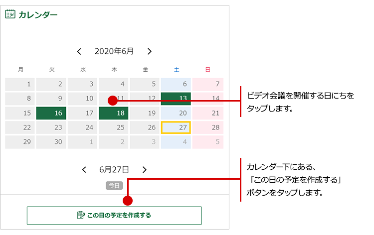 カレンダーから、ビデオ会議を開催する日にちをタップし、カレンダー下にある、「この日の予定を作成する」ボタンをタップします。