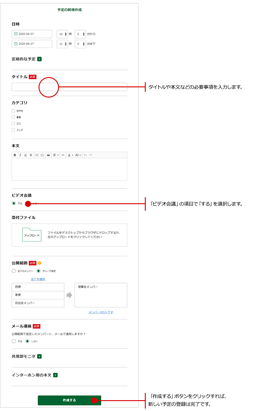 予定の入力画面が表示されるので、タイトルや本文などの必要事項を入力し、「ビデオ会議」の項目で「する」を選択します。