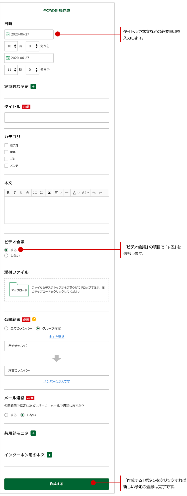 「作成する」ボタンをクリックすれば、新しい予定の登録は完了です。