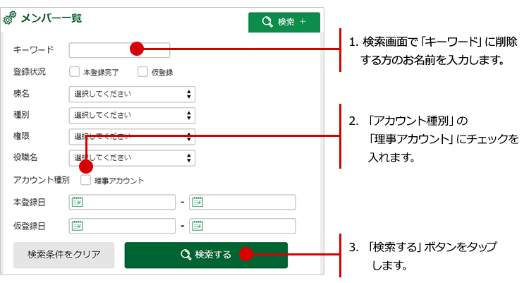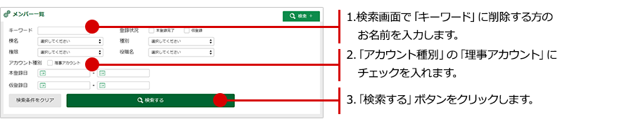 1. 検索画面で「キーワード」に削除する方のお名前を入力します。