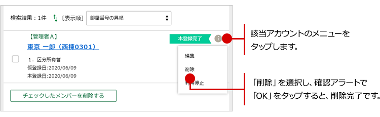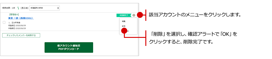該当アカウントのメニューをクリックして「削除」を選択し、