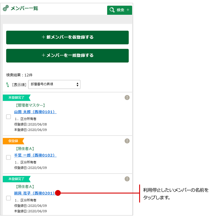 メンバー一覧が表示されますので、利用停止したいメンバーの名前をタップします。