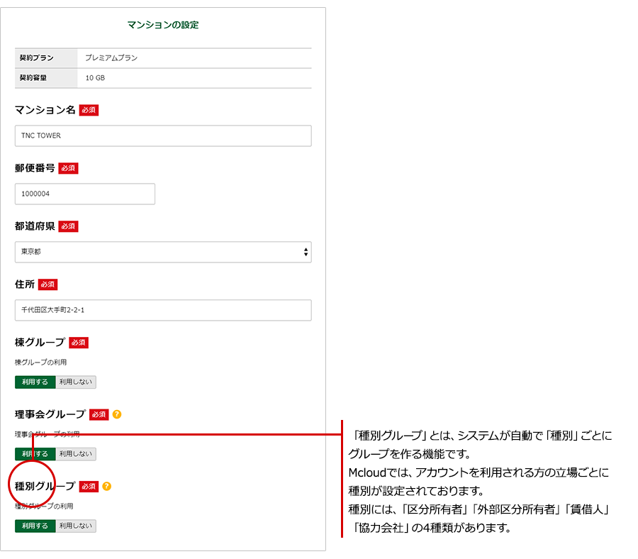 「マンションの設定」にある「種別グループ」を「利用する」に設定した場合、