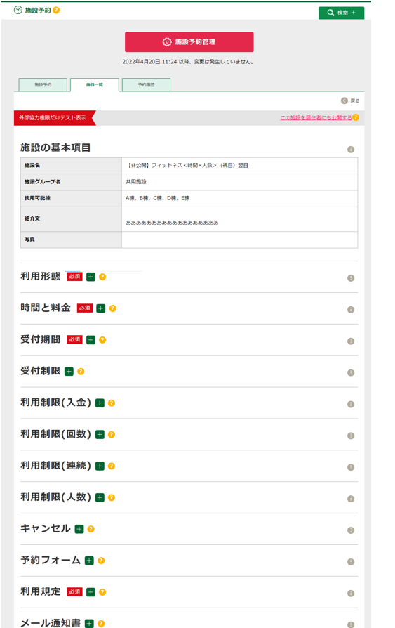 利用形態、時間と料金、受付期間、利用規定は必須項目です。これらを登録しないと施設は居住者に公開できません。予約フォームやキャンセルなども必要に応じて設定を入れてください。