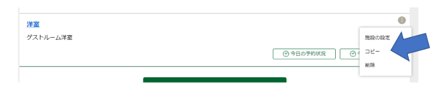 受付期間や時間と料金など同様の設定となる施設がある場合は、1つ目の施設を「コピー」することができます。コピーしたい施設のメニューから「コピー」をクリックしてください。