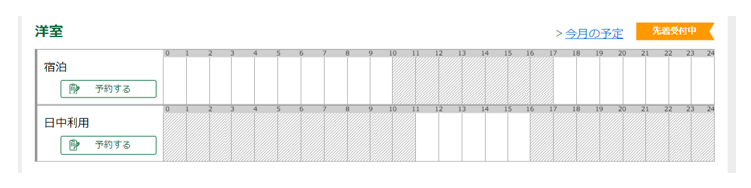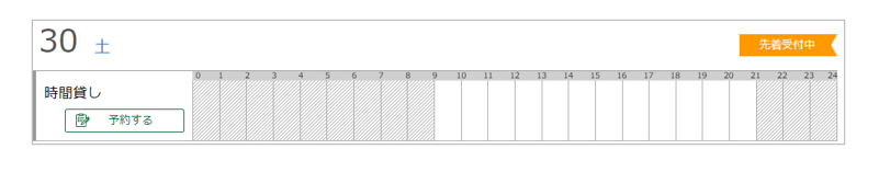 例えば、施設の稼働時間:9時~21時を設定した場合、予約カレンダーの0時~9時と21時~24時までの時間帯はグレーの斜線で表示されて、この時間帯は予約の申込ができなくなります。