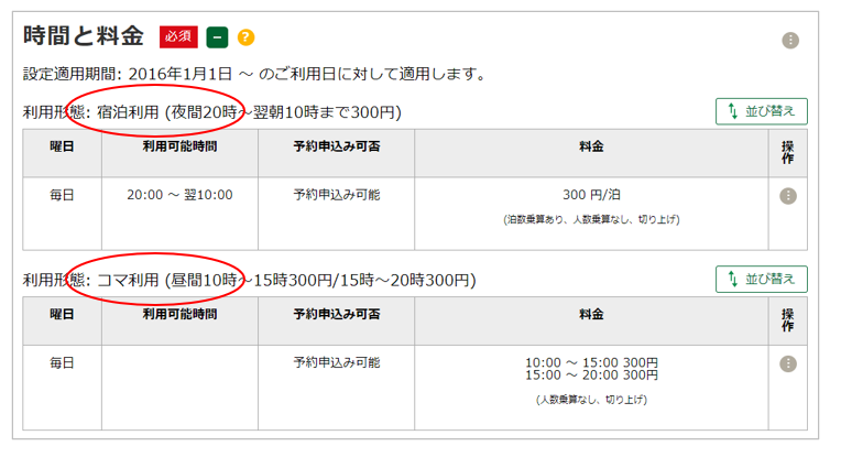 例えば、ゲストルームを18時~翌10時の宿泊貸しをして、昼間の11時~17時までは時間貸しをしている場合、「宿泊利用」と「日中利用」の2つの利用形態で、2つの「時間と料金」の設定を登録してください。